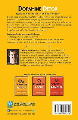 Reclaim your focus in 48 hours or less. Do you keep procrastinating? Do you feel restless and unable to focus on your work? Do you have trouble getting excited about major goals? If so, you might need a dopamine detox. In today’s world where distractions are everywhere, the ability to focus has become more and more difficult to achieve. We are constantly being stimulated, feeling restless, often without knowing why. When the time comes to work, we suddenly find an excess of other things to do. Instead of working toward our goals, we go for a walk, grab a coffee, or check our emails. Everything seems like a great idea—everything except the very things we should be doing. Do you recognize yourself in the above situation? If so, don’t worry. You’re simply overstimulated. Dopamine Detox will help you lower your level of stimulation and regain focus in 48 hours or less,so that you can tackle your key tasks. More specifically, in Dopamine Detox you’ll discover: what dopamine is and how it works; the main benefits of completing a dopamine detox; 3 simple steps to implement a successful detox in the next 48 hours; practical exercises to eliminate distractions and boost your focus; simple tools and techniques to avoid overstimulation and help you stay focused, and much more. Dopamine Detox is your must-read, must-follow guide to help you remove distractions so you can finally work on your goals with ease. If you like easy-to-understand strategies, practical exercises, and no-nonsense teaching, you will love this book.
